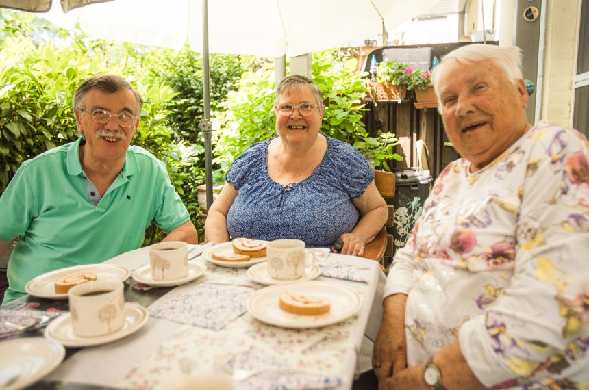 Kaffeeklatsch der Hausbewohner und Nachbarn