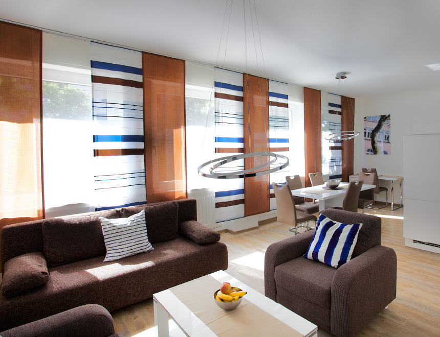 Die Gästewohnung ist über einen separaten Zugang erreichbar. Sie ist komplett möbliert und besteht aus zwei Schlafzimmern mit Doppelbett und als Doppelbett nutzbaren Einzelbetten, einer geräumigen Wohnküche mit einer voll ausgestattete Einbauküche (Kühlschrank mit Gefrierfach, E-Herd mit Ceran-Feld und Backofen, Spülmaschine und Kaffeemaschine), einem praktischen Essbereich, sowie einem Wohnbereich mit Schlafsofa (für einen erwachsenen oder zwei Kinder) und TV-Gerät. Das Tageslicht-Duschbad verfügt über eine bodengleiche Dusche. Aus Rücksichtnahme auf zukünftige Gäste versteht sich, dass in der Wohnung nicht geraucht werden darf und dass Haustiere nicht gestattet sind.